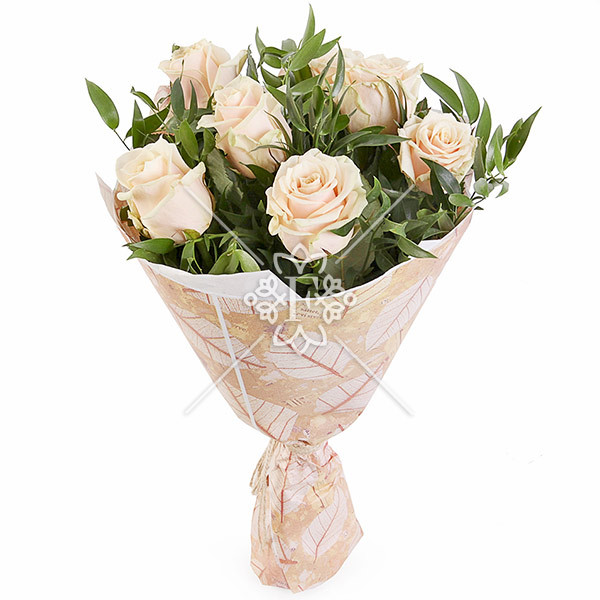 Роза кремовая 7 шт., зелень декоративная, упаковка, лента.